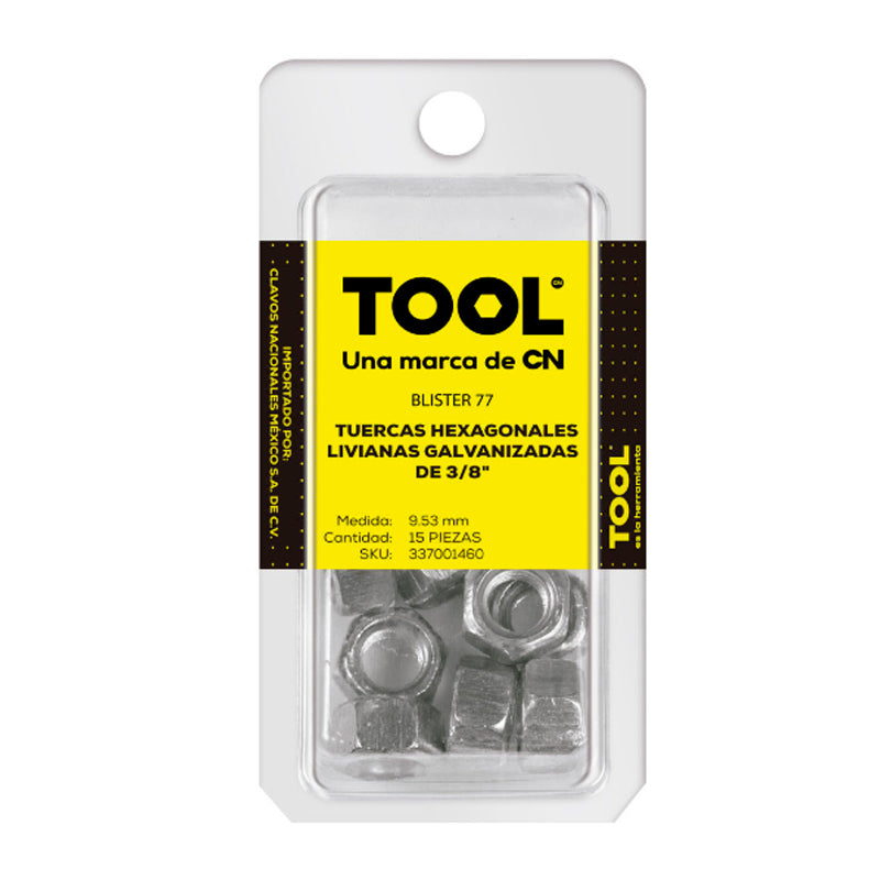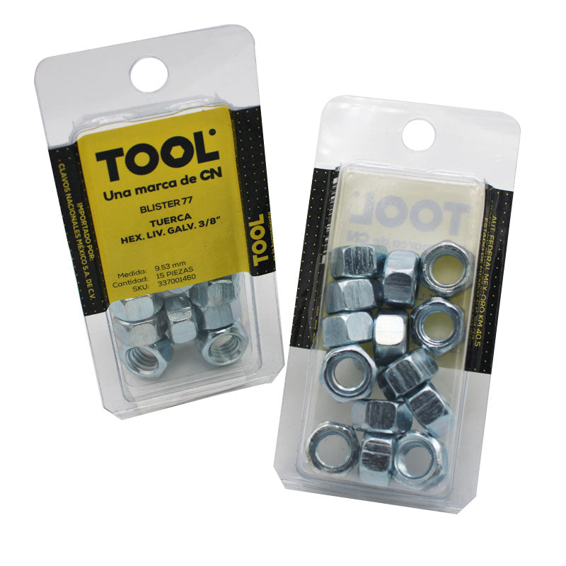 Blíster 77 Tuerca Hexagonal Liviana Galvanizada 3/8" Con 15 Piezas