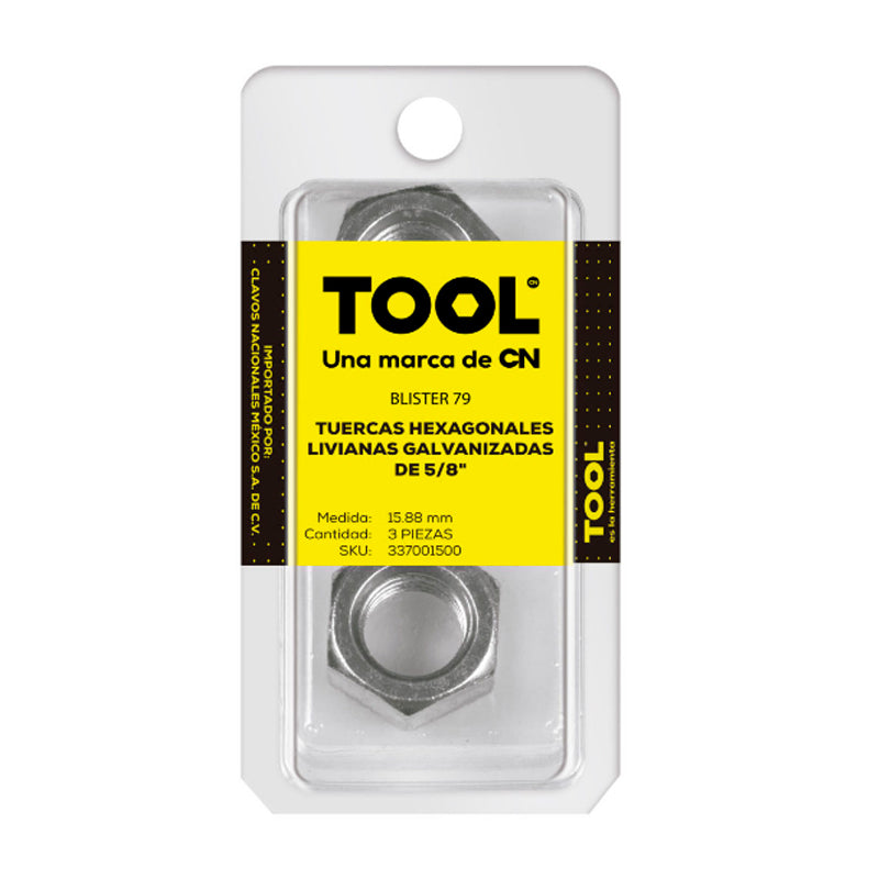 Blíster 79 Tuerca Hexagonal Liviana Galvanizada 5/8" Con 3 Piezas