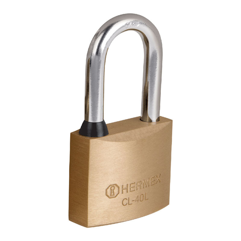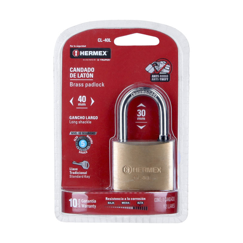 Candado de latón 40 mm gancho largo en blíster, Hermex