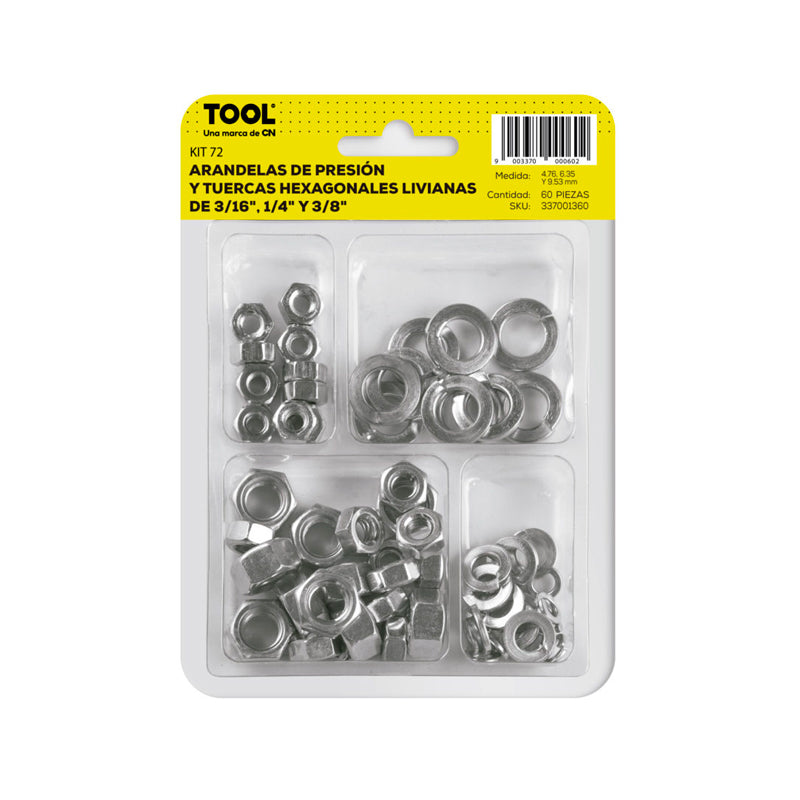 Kit72 Mix De Arandela Presión Y Tuerca Hexagonal Galvanizada 3/16,1/4/3/8