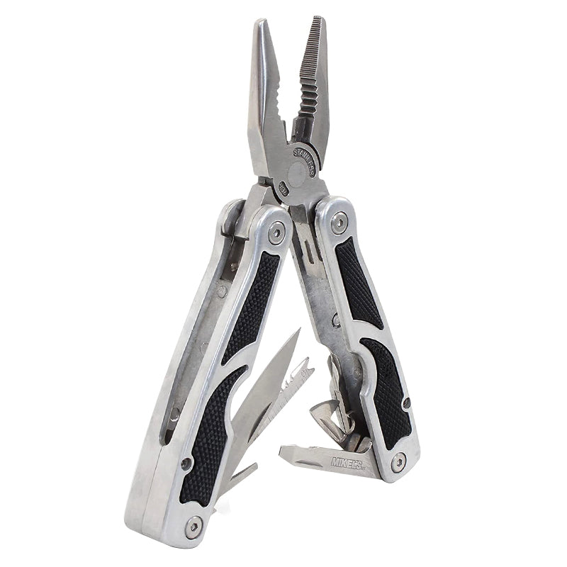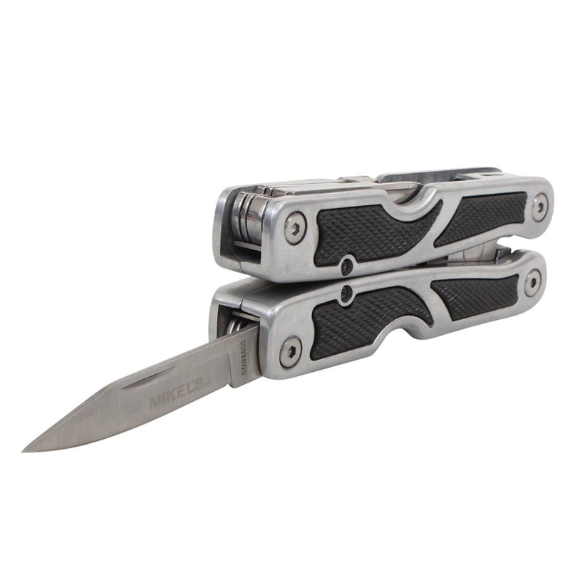 Incluye una funda de cuero y 27 funcionalidades: Pinzas, cortador de alambre, navaja, navaja chica, lima, regla, desarmador plano, desarmador plano chico, desarmador de cruz con 12 puntas intercambiables, destapador, abrebotellas, abrelatas, saca clavos, limpiauñas.