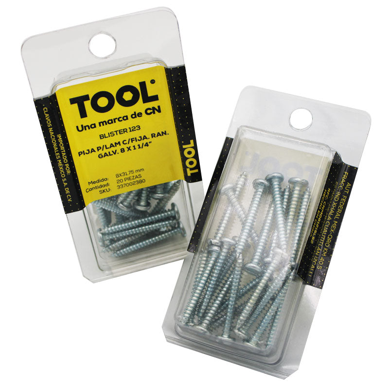 Para unir objetos metálicos, madera, fibra de vidrio y plástico. ? Blister 123 Pija P/Lam C/Fija.Ran.Gal.8X1.1/4 20Pz