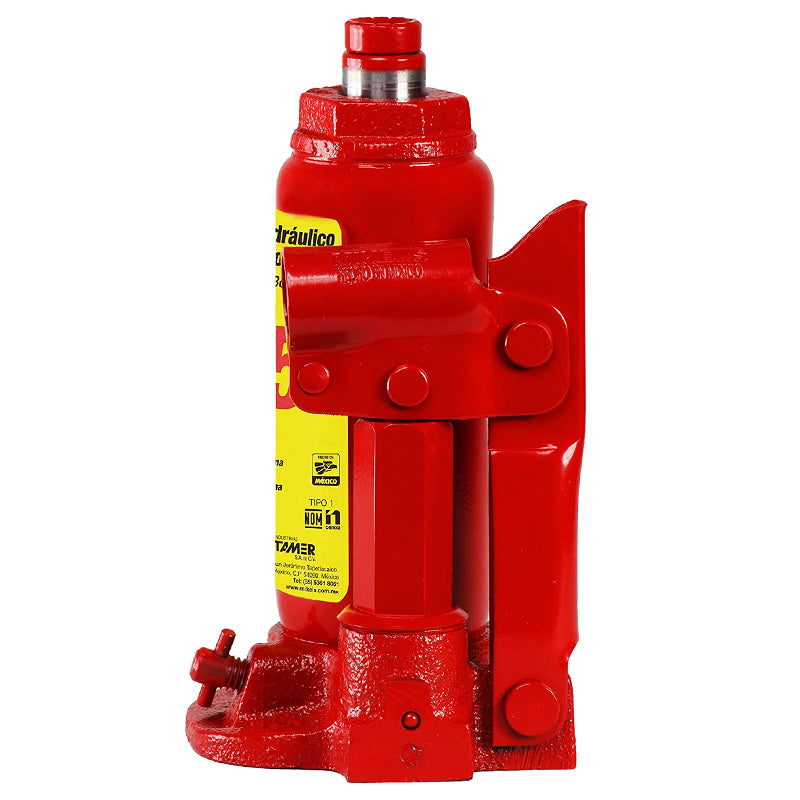 Gato hidráulico de botella para soporte y levantamiento de diversos tipos de vehículos ligeros o pesados, así como en la industria y construcción, fabricado de acero y base de hierro fundido.