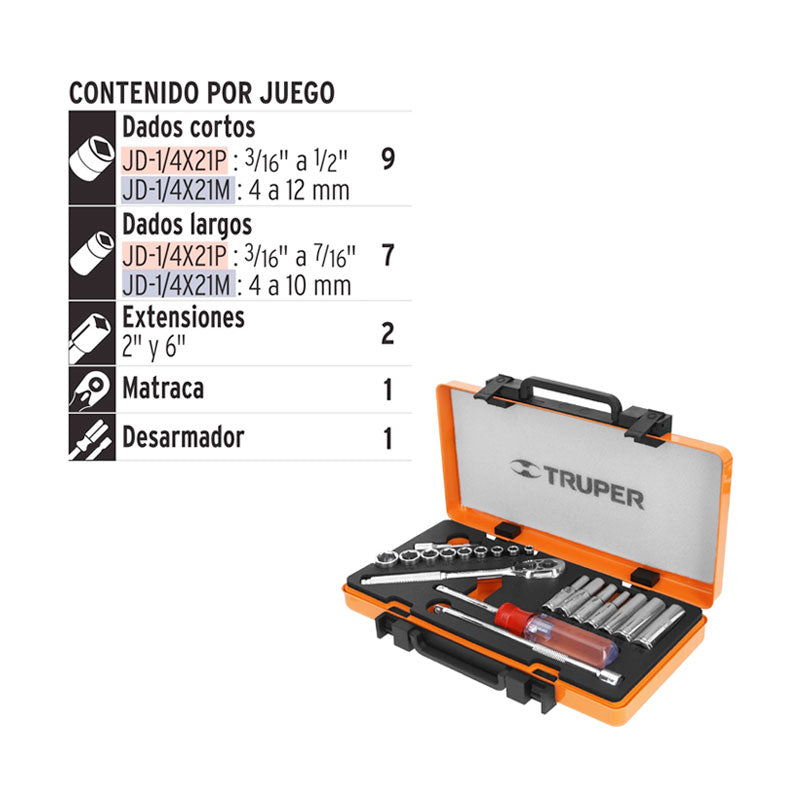 Incluye: 9 Dados cortos: 3/16" a 1/2", 7 Dados largos: 3/16" a 7/16", 2 Extensiones: 2" y 6", 1 Matraca, 1 Desarmador.