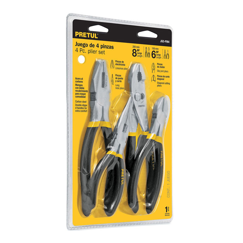 Incluye: 1 Pinza de electricista 8" (20 cm), 1 Pinza de punta y corte 6" (15 cm), 1 Pinza de corte diagonal 6" (15 cm), 1 Pinza de chofer 8" (20 cm).