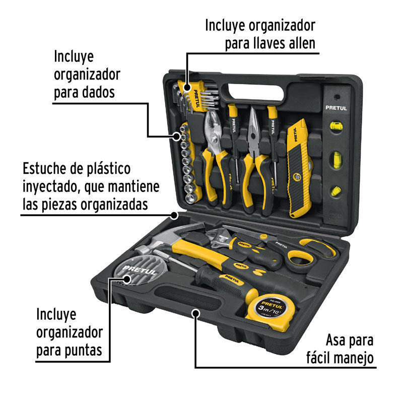 Estuche plástico inyectado que mantiene las piezas organizadas.