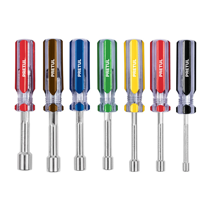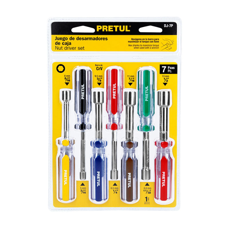 Incluye 1 Desarmador de caja de 3/16" (4.7mm), 1 Desarmador de caja de 1/4" (6.3mm), 1 Desarmador de caja de 5/16" (7.9mm), 1 Desarmador de caja de 11/32" (8.7mm), 1 Desarmador de caja de 3/8" (9.5mm), 1 Desarmador de caja de 7/16" (11.1mm), 1 Desarmador de caja de 1/2" (12.7mm)